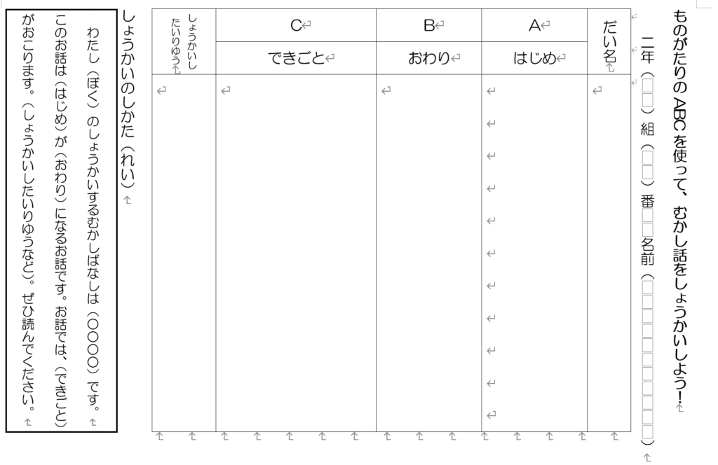 「かさこじぞう」の言語活動として、昔話を紹介しあいます。紹介する文章を書くために「ものがたりのABC」という枠組みを作って、単元を通して読み方を深めていきました。テンプレートもつけて紹介します。