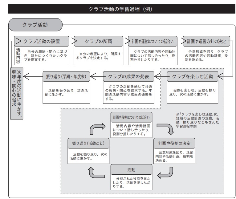 クラブの学習過程の例も示されています。学校にもよるのでしょうが、私の勤務先では月に1度程度の活動であるため、クラブを楽しむ活動とその中のサイクルが重要になるかと感じています。もしも子どもたちの希望があれば、クラブの成果の発表の機会があっても良いかもしれません。